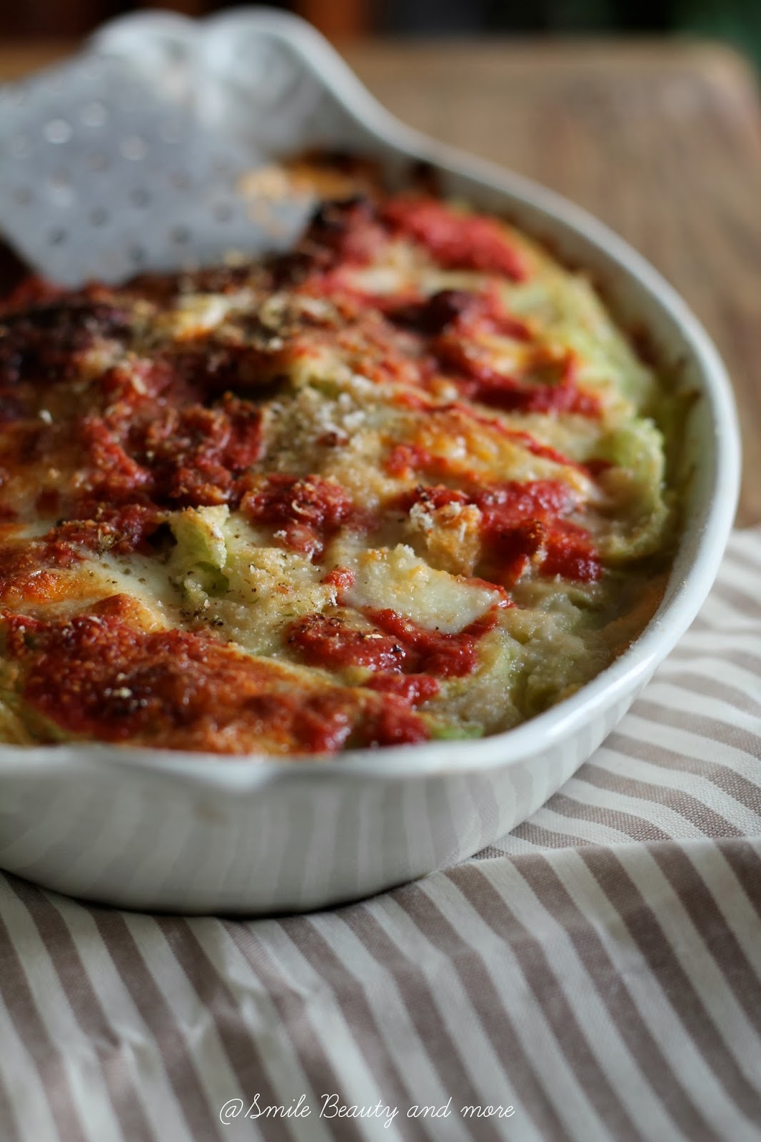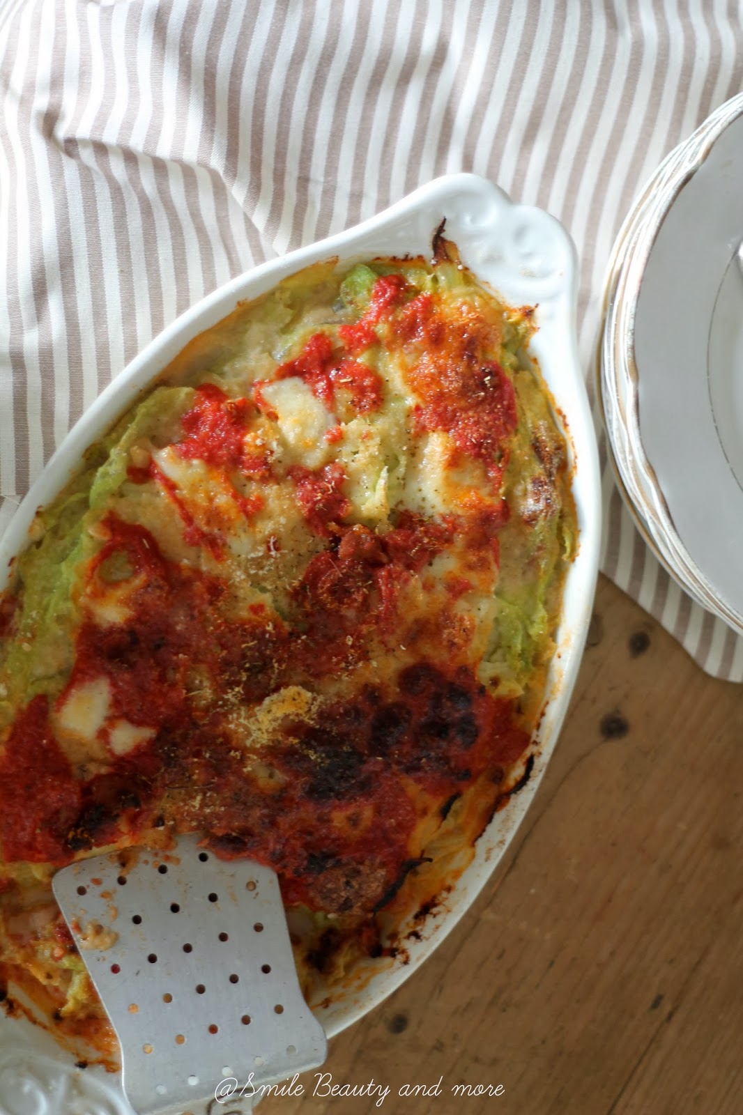 Ora che avete tutto potete comporre gli strati nella teglia, sul fondo mettete qualche noce di burro ed un pò di pan grattato, salsa, foglie di cavolo verza ben asciugate, parmigiano, mozzarella e via via fino all’ultimo strato.