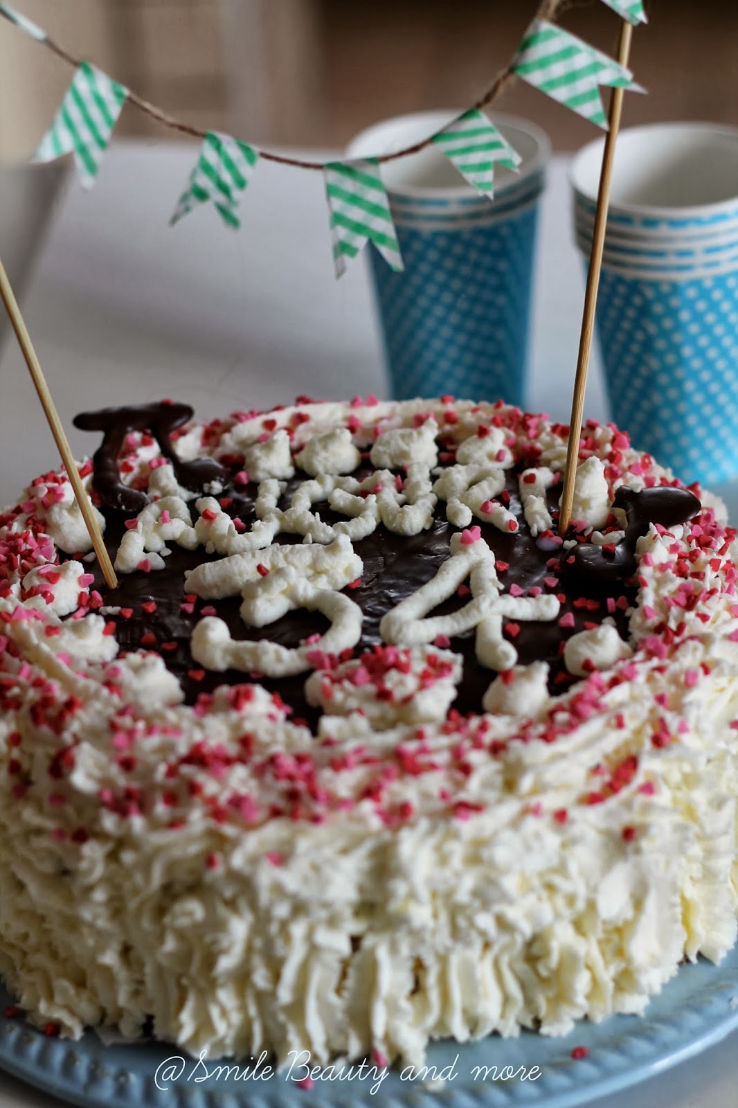 Quando il cioccolato si sarà indurito rifinite la torta con altra panna montata e zuccherini colorati, io questa volta ho utilizzato dei cuoricini.
