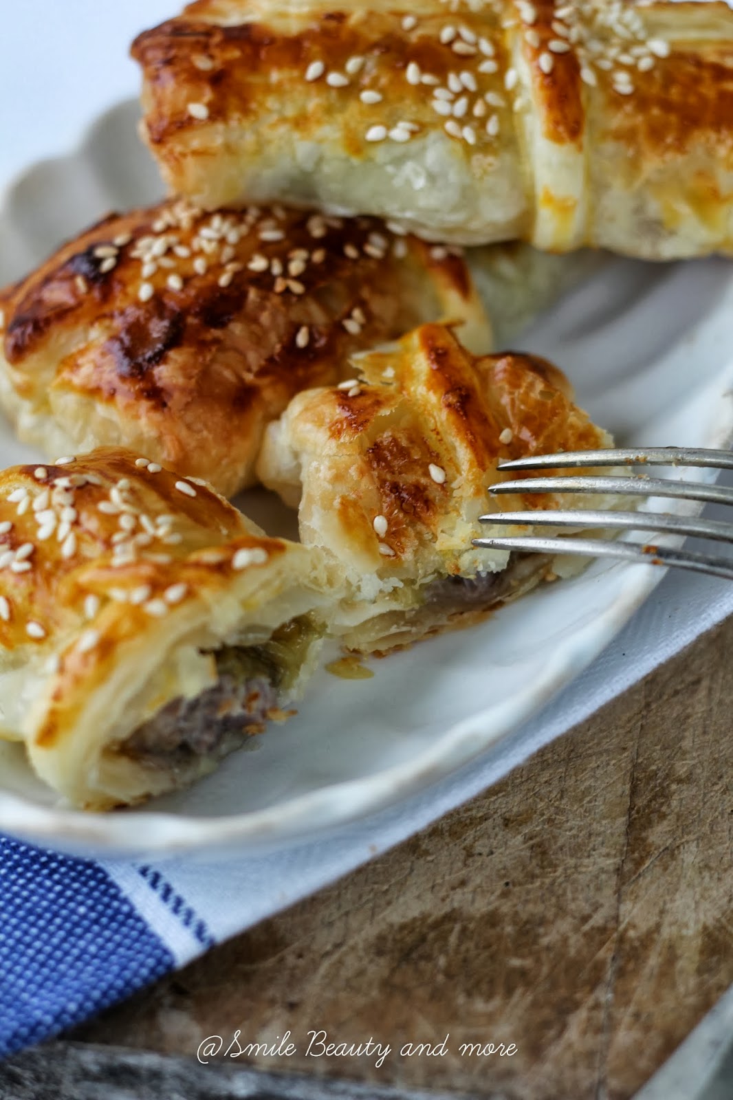Spennellate i fagottini con uovo sbattuto e guarnite con semi di sesamo.